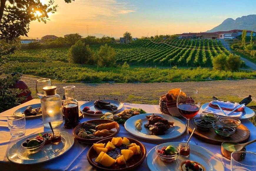 Albanian cuisine is a delicious fusion of Mediterranean and Balkan flavours, featuring fresh seafood, grilled meats, locally grown fruits and vegetables and traditional dishes, such as Byrek (savoury pastries), Tave Kosi (baked lamb with yogurt), and Fërgesë (peppers and tomatoes cooked with feta cheese).