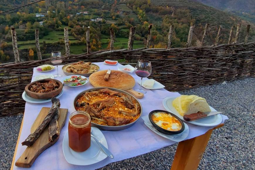Albanian cuisine is a delicious fusion of Mediterranean and Balkan flavours, featuring fresh seafood, grilled meats, locally grown fruits and vegetables and traditional dishes, such as Byrek (savoury pastries), Tave Kosi (baked lamb with yogurt), and Fërgesë (peppers and tomatoes cooked with feta cheese).